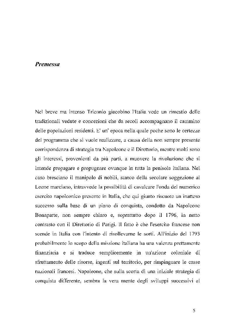 Repubblica di Brescia nel proprio escursus durante il triennio Rivoluzionario del 1797-1799 sotto il profilo della storia delle dottrine politiche, attraverso una disamina del contesto storico, politico, economico e sociale nonchè religioso e culturale della provincia di Brescia di quegli anni e del Settecento in generale.