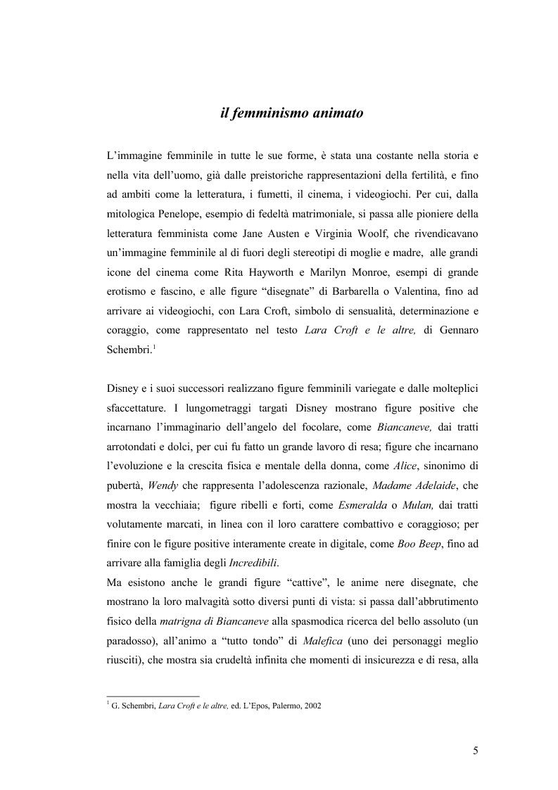 Un'analisi grafica e caratteriale delle principali figure femmili dei lungometraggi firmati Disney, dal primo lungometraggio, Biancaneve e i sette nani del 1937 a Cars del 2006. La tesi è introdotta da un primo capitolo sulle tecniche di animazione analogica e digitale, e sulla presentazione della casa Disney e della Pixar.