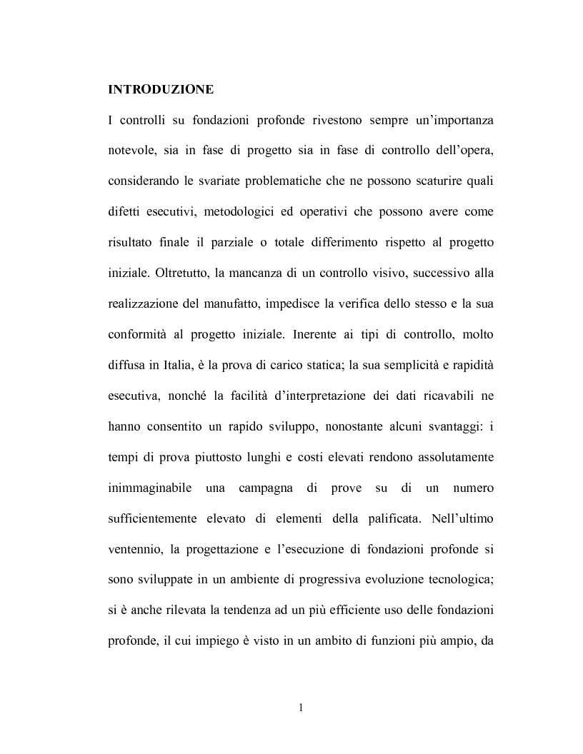 1 INTRODUZIONE I controlli su fondazioni profonde rivestono sempre un’importanza notevole, sia in fase di progetto sia in fase di controllo dell’opera, considerando le svariate problematiche che ne possono scaturire quali difetti esecutivi, metodologici ed operativi che possono avere come risultato finale il parziale o totale differimento rispetto al progetto iniziale. Oltretutto, la mancanza di un controllo visivo, successivo alla realizzazione del manufatto, impedisce la verifica dello stesso e la sua conformità al progetto iniziale. Inerente ai tipi di controllo, molto diffusa in Italia, è la prova di carico statica; la sua semplicità e rapidità esecutiva, nonché la facilità d’interpretazione dei dati ricavabili ne hanno consentito un rapido sviluppo, nonostante alcuni svantaggi: i tempi di prova piuttosto lunghi e costi elevati rendono assolutamente inimmaginabile una campagna di prove su di un numero sufficientemente elevato di elementi della palificata. Nell’ultimo ventennio, la progettazione e l’esecuzione di fondazioni profonde si sono sviluppate in un ambiente di progressiva evoluzione tecnologica; si è anche rilevata la tendenza ad un più efficiente uso delle fondazioni profonde, il cui impiego è visto in un ambito di funzioni più ampio, da
