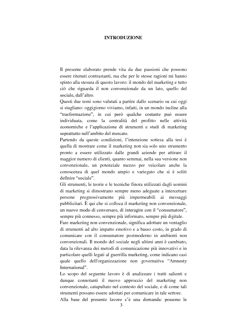 Il terzo capitolo, si concentra su un case study, la comunicazione di Amnesty International e le sue battaglia comunicative, piuttosto avanzate in termini di marketing e comunicazione rispetto alla media delle attività delle O.N.G internazionali. Attraverso una rianalisi storica si è cercato di mettere in luce le motivazioni dell'origine di Amnesty International, in seguito si è posta l'attenzione sulle varie tecniche utilizzate durante la sua storia e in particolare si sono studiate le varie campagne che questa O.N.G effettua per raggiungere gli obiettivi proposti. Grazie a uno sguardo più approfondito sulle strategie comunicative si è fatto risaltare l'aspetto più interessante ai fini della tesi. L'uso delle tecniche non convenzionali da parte di Amnesty International, riportando degli esempi delle varie campagne effettuate attraverso l'applicazione di queste nuove strategie di marketing in quanto proprio tale organizzazione ha sfruttato a 360° sia il guerrilla e si il viral marketing. Infine, nel quarto capitolo è stata condotta una piccola indagine in cui è stato rilevato il punto di vista di operatori di ONG di diverse dimensioni.