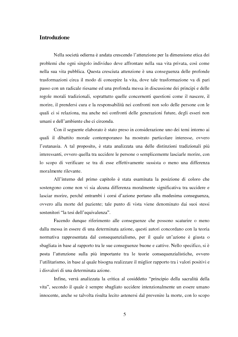 L'argomento sul quale verte la mia tesi è la filosofia morale e, più nello specifico, un settore che negli ultimi decenni è andato incontro ad un notevole sviluppo, soprattutto in America e nei paesi anglossassoni, grazie all'attualità e alla specificità dei temi trattati, ovvero la bioetica e, in particolare, l'eutanasia. La domanda alla quale cerco di rispondere attraverso il mio elaborato è se sussiste o meno una differenza moralmente rilevante tra l'uccidere e il lasciar morire: a tal scopo, ho difatto preso in considerazione quegli autori per i quali questa differenza esiste e ha delle forti ripercussioni a livello morale per poi porli a confronto con quegli autori secondo i quali invece non vi sarebbe nessuna differenza tra i due corsi d'azione. Ho inoltre cercato di esporre entrambi i punti di vista sottolineandone i pro e i contro e facendo riferimento ad esempi formulati dagli stessi autori.