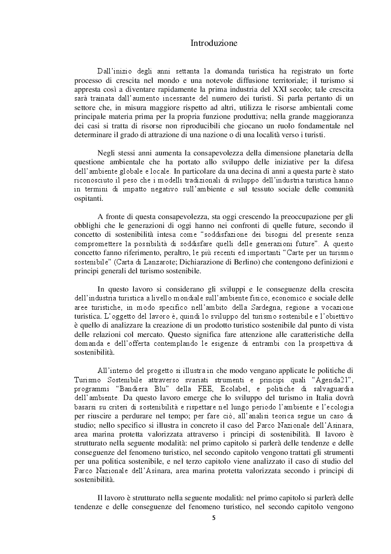 All’interno del progetto si illustra in che modo vengano applicate le politiche di Turismo Sostenibile attraverso svariati strumenti e principi quali “Agenda21”, programmi “Bandiera Blu” della FEE, Ecolabel, e politiche di salvaguardia dell’ambiente. Da questo lavoro emerge che lo sviluppo del turismo in Italia dovrà basarsi su criteri di sostenibilità e rispettare nel lungo periodo l’ambiente e l’ecologia per riuscire a perdurare nel tempo; per fare ciò, all’analisi teorica segue un caso di studio; nello specifico si illustra in concreto il caso del Parco Nazionale dell’Asinara, area marina protetta valorizzata attraverso i principi di sostenibilità. Il lavoro è strutturato nella seguente modalità: nel primo capitolo si parlerà delle tendenze e delle conseguenze del fenomeno turistico, nel secondo capitolo vengono trattati gli strumenti per una politica sostenibile, e nel terzo capitolo viene analizzato il caso di studio del Parco Nazionale dell’Asinara, area marina protetta valorizzata secondo i principi di sostenibilità.