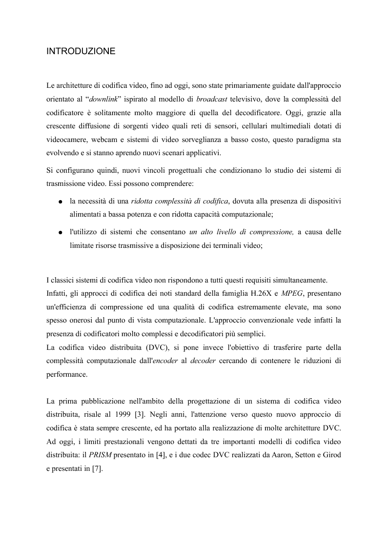 Nel secondo capitolo, vengono illustrati i lavori più significativi presenti in letteratura nell'ambito della codifica video distribuita. Il metodo di codifica scelto è invece descritto nel terzo capitolo e la sua implementazione è esposta nel quarto. I risultati di questo lavoro sono paragonati poi con quelli dei modelli di riferimento all'interno del quinto capitolo. Nel sesto