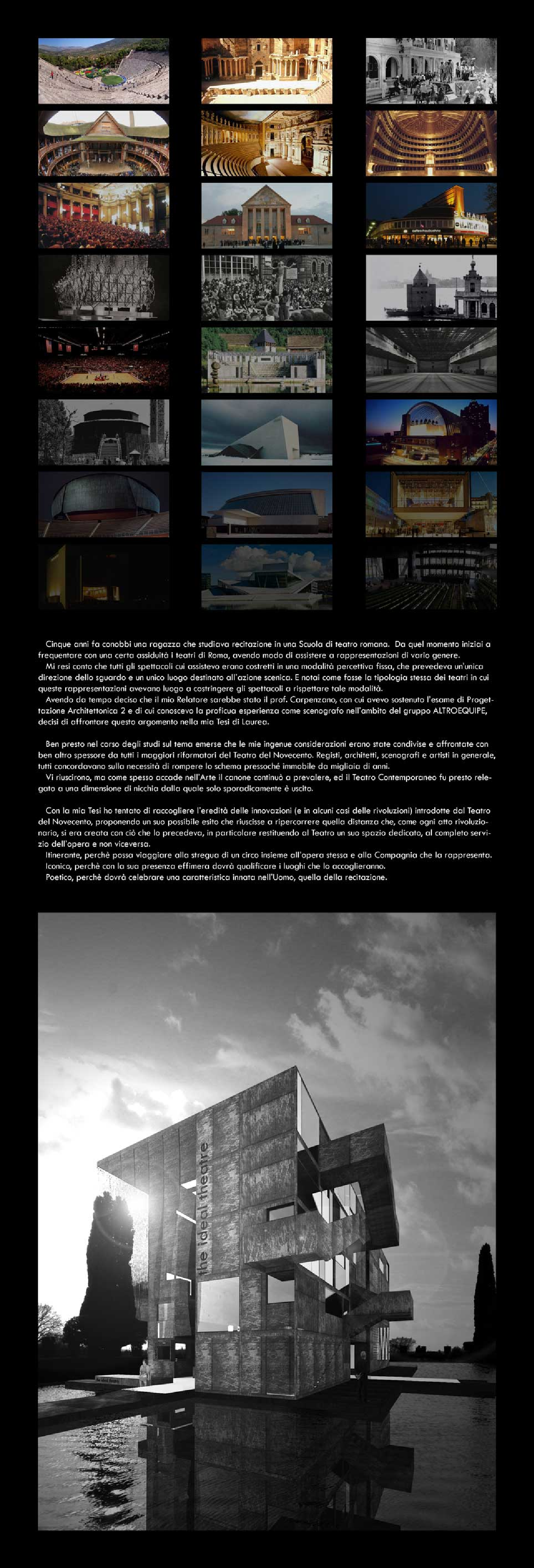 Con la mia Tesi ho tentato di raccogliere l’eredità delle innovazioni (e in alcuni casi delle rivoluzioni) introdotte dal Teatro del Novecento, proponendo un suo possibile esito che riuscisse a ripercorrere quella distanza che, come ogni atto rivoluzionario, si era creata con ciò che lo precedeva, in particolare restituendo al Teatro un suo spazio dedicato, al completo servizio dell’opera e non viceversa.