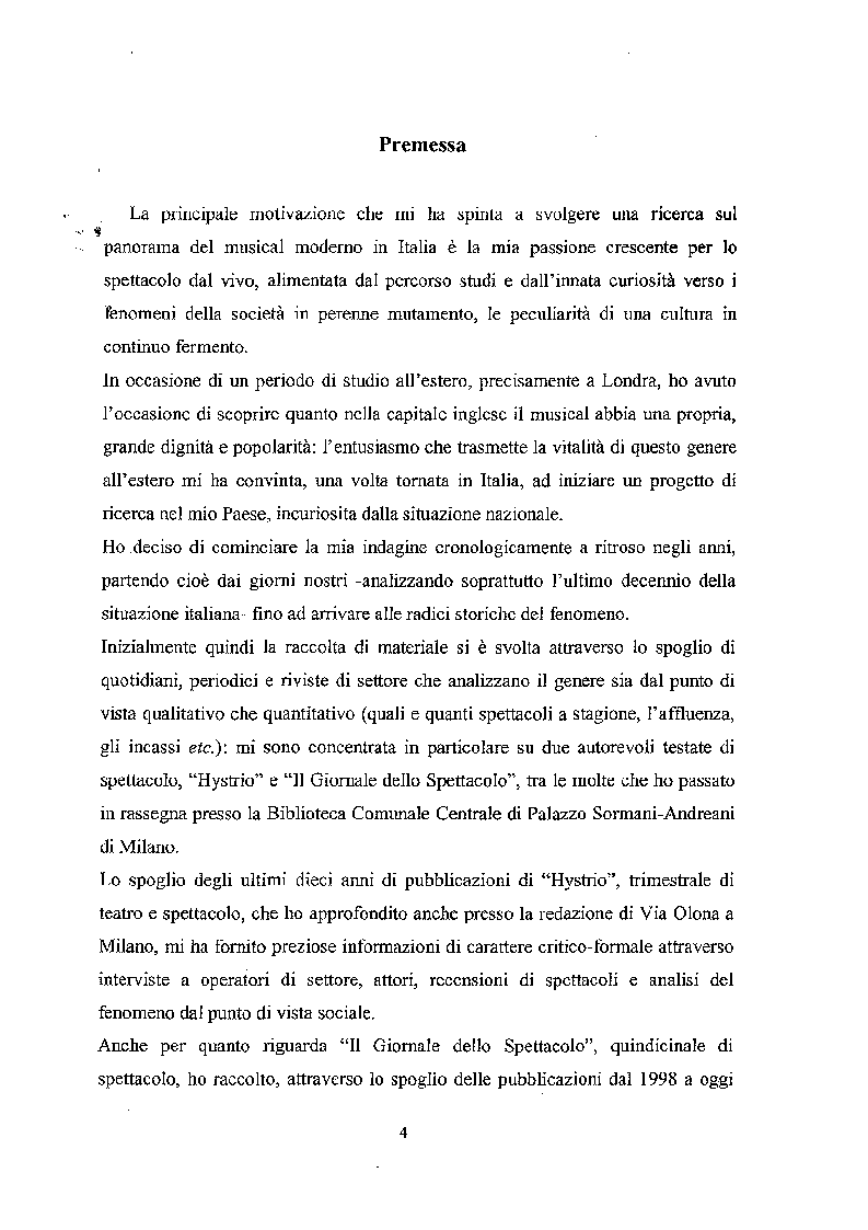 L'elaborato è un percorso che indaga il musical moderno nei suoi aspetti storici, organizzativi ed economici, vuole ricostruire il rapporto di questo genere "nuovo" e la società in cui cresce e si consolida (in particolare nel decennio passato di successi in Italia), analizza il linguaggio che utilizza con il suo pubblico e che tipo di risposta ottiene.