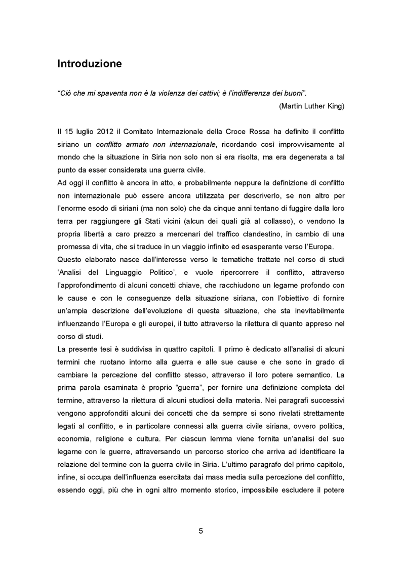 Viene inizialmente proposta l'analisi della parola 'guerra' mediante la rilettura di alcuni studiosi della materia, seguita dall'approfondimento di alcuni termini storicamente legati ai conflitti e in particolare connessi a quello siriano, ovvero politica, economia, religione e cultura. Successivamente, viene evidenziato il rapporto che i mass media hanno con la guerra, per comprendere come la loro influenza possa modificare la percezione che gli spettatori hanno del conflitto e come il potere delle informazioni distribuite possa distogliere l'attenzione da determinati argomenti.