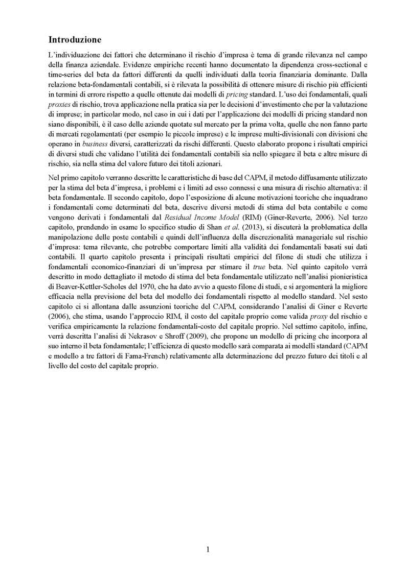 Nel primo capitolo verranno descritte le caratteristiche di base del CAPM, il metodo diffusamente utilizzato per la stima del beta d’impresa, i problemi e i limiti ad esso connessi e una misura di rischio alternativa: il beta fondamentale. Il secondo capitolo, dopo l’esposizione di alcune motivazioni teoriche che inquadrano i fondamentali come determinati del beta, descrive diversi metodi di stima del beta contabile e come vengono derivati i fondamentali dal Residual Income Model (RIM) (Giner-Reverte, 2006). Nel terzo capitolo, prendendo in esame lo specifico studio di Shan et al. (2013), si discuterà la problematica della manipolazione delle poste contabili e quindi dell’influenza della discrezionalità manageriale sul rischio d’impresa: tema rilevante, che potrebbe comportare limiti alla validità dei fondamentali basati sui dati contabili. Il quarto capitolo presenta i principali risultati empirici del filone di studi che utilizza i fondamentali economico-finanziari di un’impresa per stimare il true beta. Nel quinto capitolo verrà descritto in modo dettagliato il metodo di stima del beta fondamentale utilizzato nell’analisi pionieristica di Beaver-Kettler-Scholes del 1970, che ha dato avvio a questo filone di studi, e si argomenterà la migliore efficacia nella previsione del beta del modello dei fondamentali rispetto al modello standard. Nel sesto capitolo ci si allontana dalle assunzioni teoriche del CAPM, considerando l’analisi di Giner e Reverte (2006), che stima, usando l’approccio RIM, il costo del capitale proprio come valida proxy del rischio e verifica empiricamente la relazione fondamentali-costo del capitale proprio. Nel settimo capitolo, infine, verrà descritta l’analisi di Nekrasov e Shroff (2009), che propone un modello di pricing che incorpora al suo interno il beta fondamentale; l’efficienza di questo modello sarà comparata ai modelli standard (CAPM e modello a tre fattori di Fama-French) relativamente alla determinazione del prezzo futuro dei titoli e al livello del costo del capitale proprio.