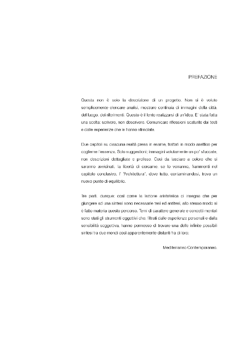 Bari: arrivando dal mare si sbarca su un promontorio dove il borgo vecchio giace arroccato. Subito dopo segue la scacchiera ottocentesca, ordinata e precisa, infine la grande espansione radiale degli anni sessanta. Essa avanza dal mare sino alla campagna, ed è solcata dalle tracce di una ferrovia con più di dodici stazioni e ottantamila passeggeri al giorno. Il territorio vive attorno a questa metropoli mediterranea. Qui il pendolarismo di operai e studenti impone uno sforzo quotidiano all'intero sistema. Più che una metropoli è una città policentrica e Bari ne è il centro. Vive giornalmente l'assedio di autombili che ne bloccano le strade. Le zone di sosta scarseggiano, i garage che sono nei sotterranei dei palazzi, registrano ordinariamente il tutto esaurito e così la città diventa un enorme parcheggio a cielo aperto. La situazione è peggiorata dalla linea ferroviaria, una vera e propria cesura tra la zona nord e quella sud della città, con due soli punti di attraversamento per veicoli e persone. Oltre che fattore negativo per il traffico, la cicatrice nel tessuto urbano è piuttosto violenta per chiunque. Passeggiando per la strada commerciale che collega il borgo antico alla stazione, ci si scontra in un fiume di metallo di là dal quale la città riprende nel disordine incontrollato, senza la continuità fisica necessaria ad imporre un disegno unitario. Per risolvere i problemi che attanagliano le nostre città bisogna ripensare gli elementi fondanti della realtà metropolitana, seguendo il suggerimento di Aldo Rossi, creatore del teatro del mondo: partire dall'uomo per tornare all'uomo. Questo è il lento realizzarsi di un’idea. Temi di carattere generale e concetti mentali sono stati gli strumenti oggettivi che, filtrati dalle esperienze personali e dalla sensibilità soggettiva, hanno permesso di trovare una delle infinite possibili sintesi tra due mondi così apparentemente distanti fra di loro: Mediterraneo e Contemporaneo.