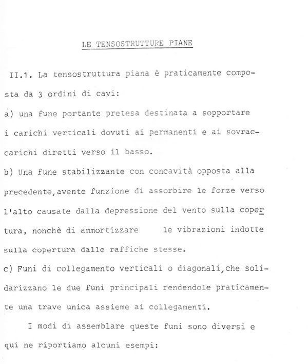 La tesi risale al 1982. Il personal computer, come lo conosciamo oggi, non esisteva. Era appena uscito lo spectrum 48k e il commodore 64, i software che oggi girano sui personal si avevano solo pressi i centri di calcolo universitari,con input ad istruzioni singole, tradotte in schede perforate. I risultati si avevano il giorno dopo l'input senza modellazione a video. L'argomento non aveva precedenti in sede universitaria e non avevo alcun esempio da seguire. Il Prof. Danieli mi avvisò che la facoltà non aveva software per strutture a fune con elementi in sola trazione e di meditare una diversa tesi. Vista l'insistenza, mi chiese di attendere qualche settimana per vedere se era reperibile presso altre università, anche estere, un software dedicato in grado di calcolare strutture di quel tipo. Quando tornai per avere notizie, la risposta fu che non vi era software dedicato accessibile presso centri di calcolo, avendo contattato anche Otto Frei, progettista della copertura dello stadio olimpico di Monaco: il software era realizzato in proprio e non era disponibile. Trattandosi di un software per analisi in grandi spostamenti, o lo realizzavo ad hoc oppure dovevo utilizzare un sofware disponibile presso il centro di calcolo (facoltà Informatica) che analizzasse strutture in campo geometrico non lineare,da adattare al mio problema. L'università disponeva del "MARC", che aveva routines di calcolo non lineare di vario tipo e prevedeva i grandi spostamenti. Portai in casa dello studente alcuni libroni di istruzioni in inglese, con gli auguri del caso. Trassi dai voluminosi manuali una sottosezione che faceva per me, ovvero alcuni moduli che permettevano lo studio di aste nello spazio in regime di grandi spostamenti, con la possibilità di inserire tensioni iniziali non nulle. Optai per una struttura bidimensionale,avendo letto come trovare lo stato di pretensione di una trave di funi, utilizzando solo sistemi di equazioni lineari (fase 1, ricerca di forma). Occorreva dotarsi di un programma che risolvesse i sistemi di equazioni lineari per molte incognite, per trovare una trave pretesa da studiare sotto carico al centro di calcolo, successivamente, in regime non lineare. Allo scopo utilizzai il mio Spectrum 48 k, con un software autoprodotto per la soluzione di sistemi lineari e il calcolo delle pretensioni di tutte le funi. Sequestrato il tv 5 pollici del mio compagno di stanza, Rocco, cominciai a manipolare le prime travi pretese utilizzando i metodi descritti in bibliografia e il mio programma. Nei provai a decine, individuando la forma voluta,prima di passare al calcolo sotto carico al centro di calcolo. Fornivo in input la geometria corredata di tutti gli sforzi di pretensione nelle aste,calcolate col mio "personal" preliminarmente. Studiai prima una struttura di prova a 4 funi,con un solo nodo libero,per testare la convergenza sotto carico,con ottimi risultati.I primi output sulla trave di progetto furono deludenti, il MARC si interrompeva per singolarità nella matrice: la tensostruttura, essendo molto deformabile, non poteva studiarsi caricandola come una trave normale, ritenendo ininfluenti le deformazioni sullo stato iniziale. Il carico fu quindi diviso in steps e istruii il computer di analizzare la trave per successive iterazioni di carichi,aggiornando la matrice alla fine di ogni step. Finalmente nessuna interruzione,il calcolo arrivò a buon fine. Il programma permetteva il plottaggio della struttura con la deformata e finalmente potei controllare i risultati,perfettamente congruenti con tensostrutture esistenti della stessa luce (circa 50 metri),di cui avevo i risultati di calcolo pubblicati. Il confronto assicurò i relatori che il mio approccio era valido e il metodo funzionava. Il calcolo venne poi affinato, e solo dopo aver risolto tutti i problemi residui (aste diagonali scariche sotto neve, riduzione delle deformazioni,controllo della risonanza ecc.) passai al progetto architettonico. Completai "a mano" i calcoli di tutta la piscina, telai, nodi, fondazioni ecc.. Successivamente alla laurea ho messo a punto un programma non lineare dedicato, utilizzando il basic sotto DOS. Recentemente l'ho migliorato e compilato su pc sotto Windows,utilizzando "freebasic". Si ottengono calcoli e disegni delle deformate sull'esistente, stampabili. Vi sono 2 files, il primo per la ricerca di forma, il secondo per la verifica non lineare sotto carico. Il metodo e una videata dei risultati sono liberamente scaricabili cliccando sul link in basso,che riporta una mia pubblicazione edita dall'Ordine degli Ingg. di Catania. Questa tesi fu allora premiata a Milano presso il centro CISIA, è stata pubblicata su 2 riviste (Acciaio 1984 e Quarry and Construction 1984) e contribuì alla lode. Non sono pubblicabili circa 400 pagine A3 di calcolo elettronico.