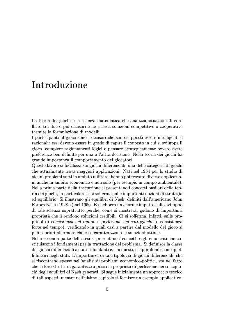 i fondamenti per la trattazione del problema. Si definisce la classe dei giochi differenziali a stati ridondanti e, tra questi, si approfondiscono quelli lineari negli stati. L'importanza di tale tipologia di giochi differenziali, che si riscontrano spesso nell'analisi di problemi economico-politici, sta nel fatto che la loro struttura garantisce a priori la proprietà di perfezione nei sottogiochi degli equilibri di Nash generati. Si segue inizialmente un approccio teorico di tali aspetti, mentre nell'ultimo capitolo si fornisce un esempio applicativo.