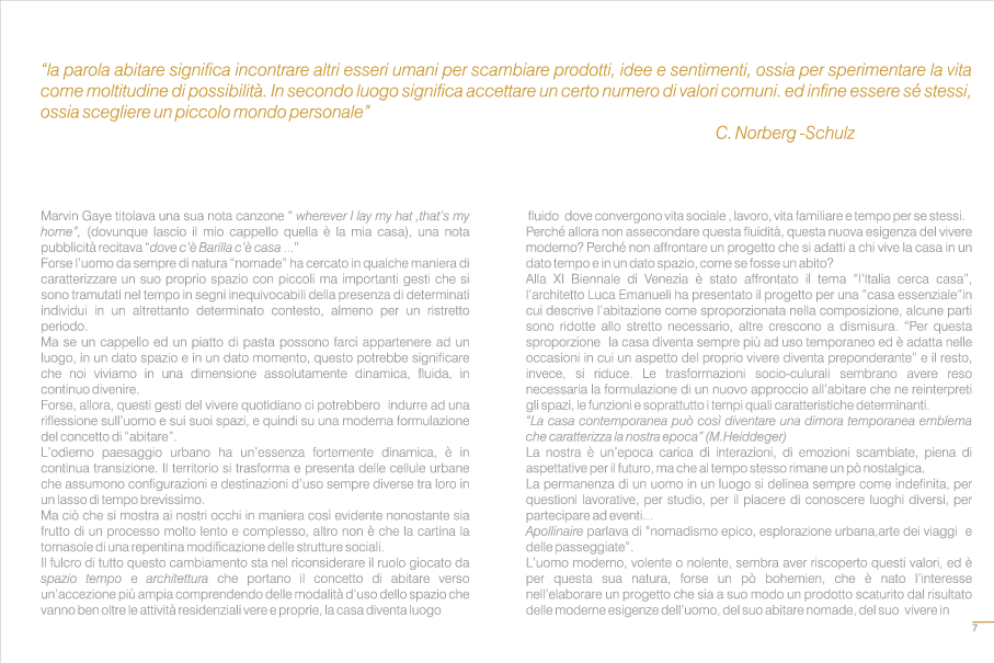 La tesi nasce in maniera quasi spontanea dalla pura osservazione del vivere quotidiano, che mi ha portato ad una riflessione sull’uomo, sul modo in cui questo occupa i suoi spazi privati e quindi su un nuovo concetto di "abitare".