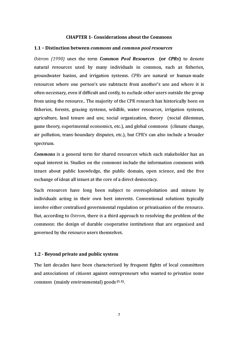 In this dissertation, the first chapter will explain the definitions of Commons and Common Pool Resources (CPRs), then it will focus on the overcoming of the traditional private and public systems, the distinction between the existing type of goods, A historic overview of the subject of Commons and finally, the debate which dates back to Hardin (1968).