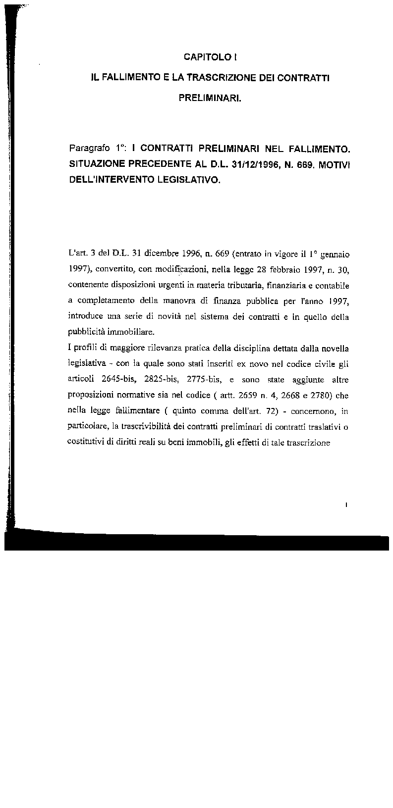 La trascrivibilità del contratto preliminare a seguito dell'intervento legislativo D.L. 669/97, convertito in Legge 30/97. Dopo numerosi dibattiti e convegni internazionali iniziati già negli anni '70 si è deciso un intervento in sede legislativa per regolare il fenomeno particolarmente diffuso della contrattazione preliminare nella compravendita di beni immobili. Nella tesi, mi occupo soprattutto del problema dei numerosissimi fallimenti di imprese costruttrici che ha colpito l'Italia a partire dagli anni '80. L'aspetto essenziale consiste nella ricerca della TUTELA da attribuire ai promissari acquirenti di beni immobili, che nella maggior parte delle ipotesi sono semplici privati interessati a "fermare", sborsando rilevanti anticipi prezzo, una proposta interessante per l'acquisto di una abitazione.