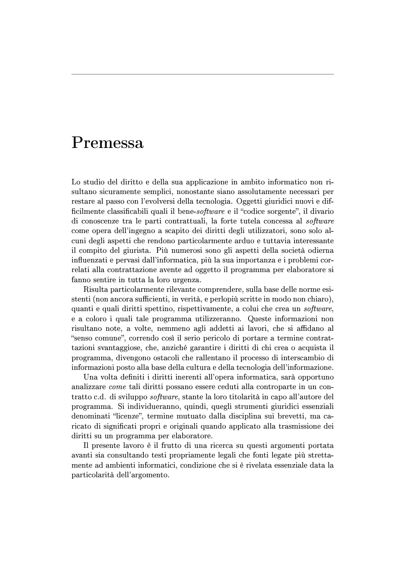Lo studio del diritto e della sua applicazione in ambito informatico non risultano sicuramente semplici, nonostante siano assolutamente necessari per restare al passo con l'evolversi della tecnologia. Oggetti giuridici nuovi e difficilmente classicabili quali il bene-software e il codice sorgente, il divario di conoscenze tra le parti contrattuali, la forte tutela concessa al software come opera dell'ingegno a scapito dei diritti degli utilizzatori, sono solo alcuni degli aspetti che rendono particolarmente arduo e tuttavia interessante il compito del giurista. Più numerosi sono gli aspetti della società odierna influenzati e pervasi dall'informatica, più la sua importanza e i problemi correlati alla contrattazione avente ad oggetto il programma per elaboratore si fanno sentire in tutta la loro urgenza.