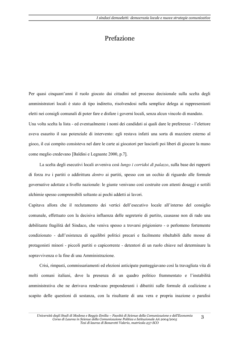 Per quasi cinquant’anni il ruolo giocato dai cittadini nel processo decisionale sulla scelta degli amministratori locali è stato di tipo indiretto, risolvendosi nella semplice delega ai rappresentanti eletti nei consigli comunali di poter fare e disfare i governi locali, senza alcun vincolo di mandato. Una volta scelta la lista l’elettore aveva esaurito il suo potenziale di intervento: egli restava infatti una sorta di mazziere esterno al gioco, il cui compito consisteva nel dare le carte ai giocatori per lasciarli poi liberi di giocare la mano come meglio credevano. La scelta degli esecutivi locali avveniva così lungo i corridoi di palazzo, sulla base dei rapporti di forza tra i partiti o addirittura dentro ai partiti, spesso con un occhio di riguardo alle formule governative adottate a livello nazionale: le giunte venivano così costruite con attenti dosaggi e sottili alchimie spesso comprensibili soltanto ai pochi addetti ai lavori. Capitava allora che il reclutamento dei vertici dell’esecutivo locale all’interno del consiglio comunale, effettuato con la decisiva influenza delle segreterie di partito, causasse non di rado una debilitante fragilità del Sindaco.. Crisi, rimpasti, commissariamenti ed elezioni anticipate punteggiavano così la travagliata vita di molti comuni italiani, dove la presenza di un quadro politico frammentato e l’instabilità amministrativa che ne derivava rendevano preponderanti i dibattiti sulle formule di coalizione a scapito delle questioni di sostanza, con la risultante di una vera e propria inazione o paralisi dell’attività amministrativa. Nonostante i suoi evidenti limiti e le proposte di riforma avanzate, questo ordinamento, rimase in vigore per decenni e venne parzialmente modificato solo nel 1990 con l’introduzione della sfiducia costruttiva e la possibilità di chiamare a far parte della giunta persone esterne al consiglio (legge n.142/1990). Ma tre anni dopo, sotto la spinta verso il maggioritario, l’abolizione delle preferenze multiple sancita dal referendum del 1991 e nel clima politico determinatosi nel dopo-Tangentopoli, il Parlamento (Governo Amato I, DC-PSI-PSDI-PLI) varava finalmente un provvedimento fortemente innovativo che prevedeva l’investitura popolare diretta dei vertici delle Amministrazioni locali (legge n.81/1993). L’elezione diretta dei sindaci non si distingue solo per essere la pietra miliare delle riforme elettorali: essa è anche la riforma che ha funzionato meglio. A questo proposito, dopo un decennio, è d’obbligo un bilancio provvisorio: era davvero necessaria la riforma? E quali effetti positivi ha avuto? Come hanno risposto gli elettori e le elite politiche alle nuove regole elettorali? Quanto e come è cambiata la competizione politica locale? Nei primi due capitoli, il lettore troverà un’attenta analisi dello status quo ante 1993, rifletterà sull’erosione che si è consumata in quegli anni nel rapporto tra i cittadini e la politica, constaterà lo stato di salute dei partiti tra astensionismo e smobilitazione e comprenderà i motivi di un cambiamento necessario che è stato a un tempo istituzionale, elettorale e partitico.Nei due capitoli centrali - che affrontano via via i temi della nuova rappresentanza, dei nuovi sistemi elettorali, della proposta partitica nel corso della campagna - verranno invece tracciate le premesse di quello che può considerarsi un bilancio positivo dei nuovi sindaci elettivi.Da ultimo, nei capitoli 5 e 6, ci si occuperà della comunicazione politica che la nuova democrazia locale impone. Marketing politico, personalizzazione e incumbency sono i tre capisaldi della nuova campagna elettorale, di cui è doveroso tenere conto anche nelle realtà territoriali più piccole. A questo proposito verrà analizzato il caso concreto delle elezioni tenutesi il 3 e 4 aprile 2005 a Luzzara, comune sotto i 15.000 abitanti in provincia di Reggio Emilia, le cui dinamiche elettoral-propagandistiche risultano ben note a chi scrive perchè impegnato, in quella sede, nella duplice veste di candidato per il consiglio comunale e di addetto stampa e direttore della comunicazione di campagna della lista di centrosinistra “Uniti per Luzzara”. In conclusione, nel capitolo 7, ci sarà spazio per una rilettura delle tematiche esposte, nell’ottica di una - auspicabile - trasformazione in senso maggioritario della vita politica italiana, sospinti dal fortunato esperimento riformatore portato avanti per dieci anni nei Comuni italiani.