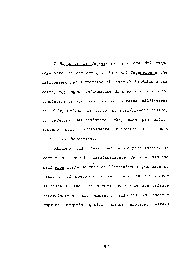 Decodificazione del linguaggio cinematografico pasoliniano inerente al film ‘I racconti di Canterbury’, tenendo presente e l’ideologia del regista e il contesto storico all’interno del quale egli ha operato e la sua attività di letterato, poeta, giornalista oltreché cineasta. Esame dell’opera chauceriana in particolar modo dei Canterbury Tales, fonte letteraria alla quale Pasolini si è ispirato per la realizzazione del suo film.