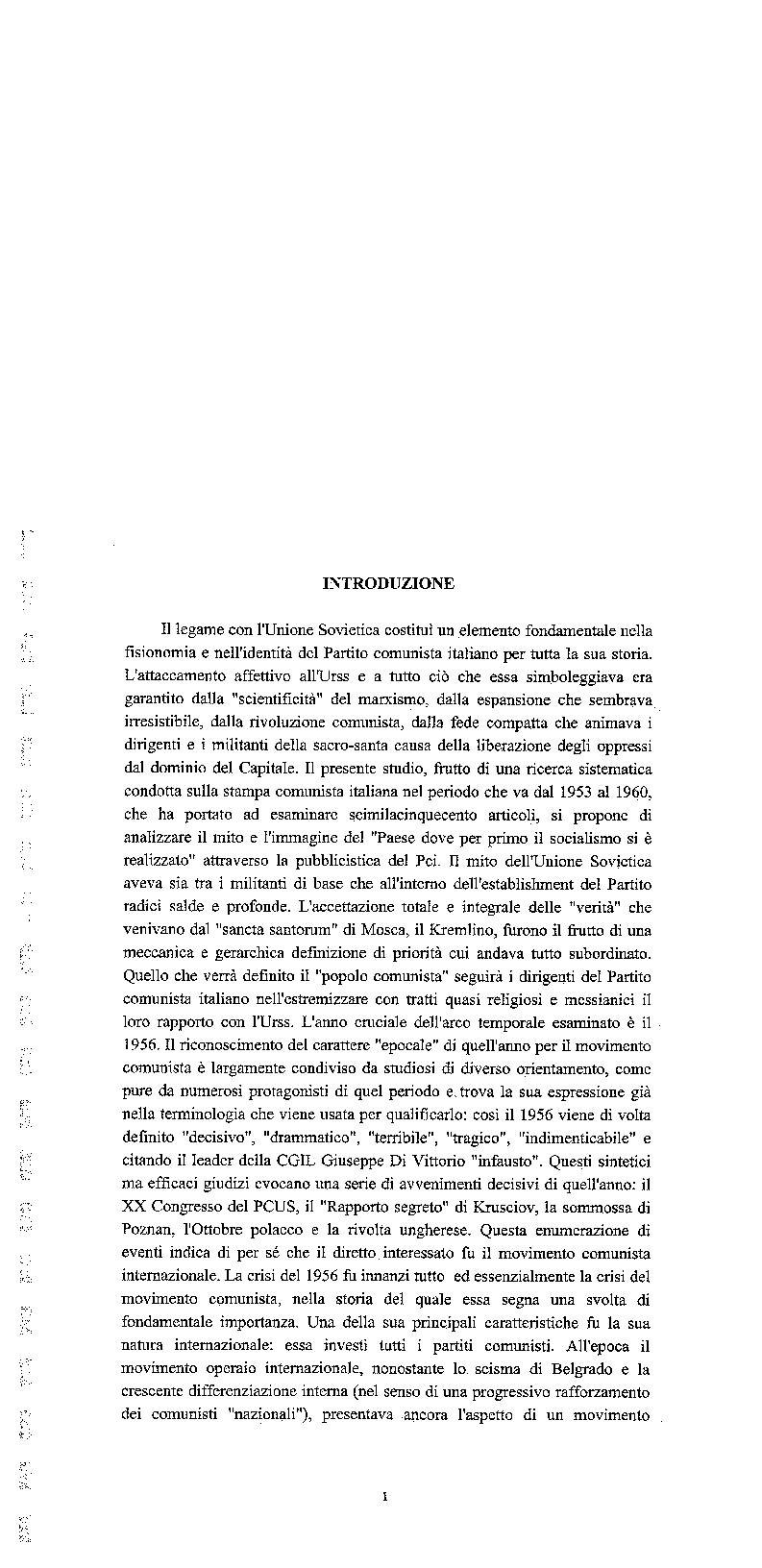 Il legame con l'Unione Sovietica costituì un elemento fondamentale nella fisionomia e nell'identità del Partito comunista italiano per tutta la sua storia. L'attaccamento affettivo all'Urss e a tutto ciò che essa simboleggiava era garantito dalla “scientificità” del marxismo, dalla espansione che sembrava irresistibile, dalla rivoluzione comunista, dalla fede compatta che animava i dirigenti e i militanti della sacro-santa causa della liberazione degli oppressi dal dominio del Capitale. Il presente studio, frutto di una ricerca sistematica condotta sulla stampa comunista italiana nel periodo che va dal 1953 al 1960, che ha portato ad esaminare seimilacinquecento articoli, si propone di analizzare il mito e l'immagine del “Paese dove per primo il socialismo si è realizzato” attraverso la pubblicistica del P.C.I..
