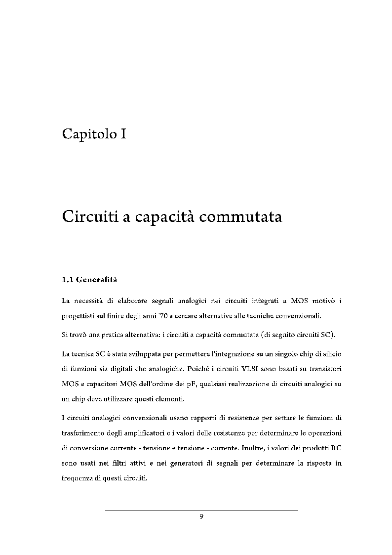 Obiettivo di questo elaborato è mostrare i principi base che sottendono alle operazioni dei circuiti a capacità commutata e mostrare come il concetto di capacitore commutato può essere utilizzato per realizzare una grande varietà di circuiti, in particolare filtri, che hanno il vantaggio di essere molto compatti e regolabili.