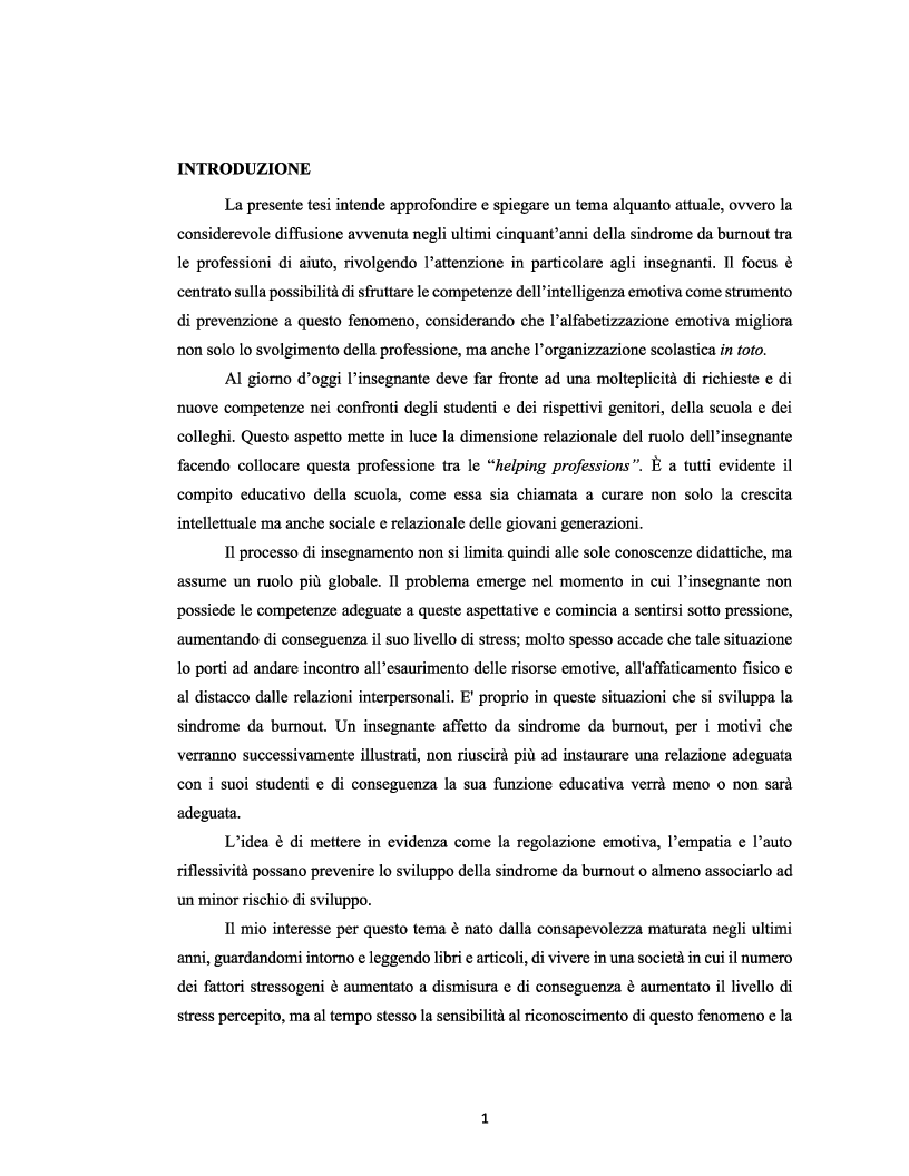 La presente tesi intende approfondire e spiegare un tema alquanto attuale, ovvero la considerevole diffusione avvenuta negli ultimi cinquant’anni della sindrome da burnout tra le professioni di aiuto, rivolgendo l’attenzione in particolare agli insegnanti. Il focus è centrato sulla possibilità di sfruttare le competenze dell’intelligenza emotiva come strumento di prevenzione a questo fenomeno, considerando che l’alfabetizzazione emotiva migliora non solo lo svolgimento della professione, ma anche l’organizzazione scolastica in toto.