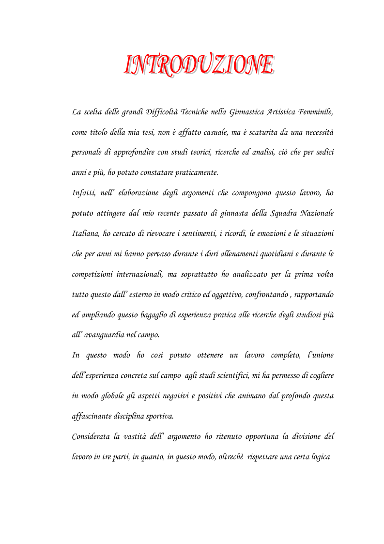 La scelta delle grandi Difficoltà Tecniche nella Ginnastica Artistica Femminile, come titolo della mia tesi, non è affatto casuale, ma è scaturita da una necessità personale di approfondire con studi teorici, ricerche ed analisi, ciò che per sedici anni e più, ho potuto constatare praticamente.