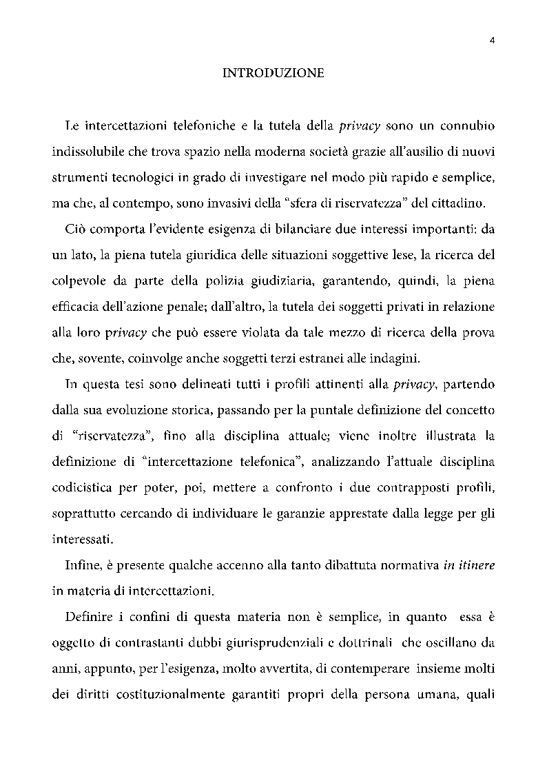 In questa tesi sono delineati tutti i profili attinenti alla privacy, partendo dalla sua evoluzione storica, passando per la puntale definizione del concetto di “riservatezza”, fino alla disciplina attuale; viene inoltre illustrata la definizione di “intercettazione telefonica”, analizzando l’attuale disciplina codicistica per poter, poi, mettere a confronto i due contrapposti profili, soprattutto cercando di individuare le garanzie apprestate dalla legge per gli interessati.