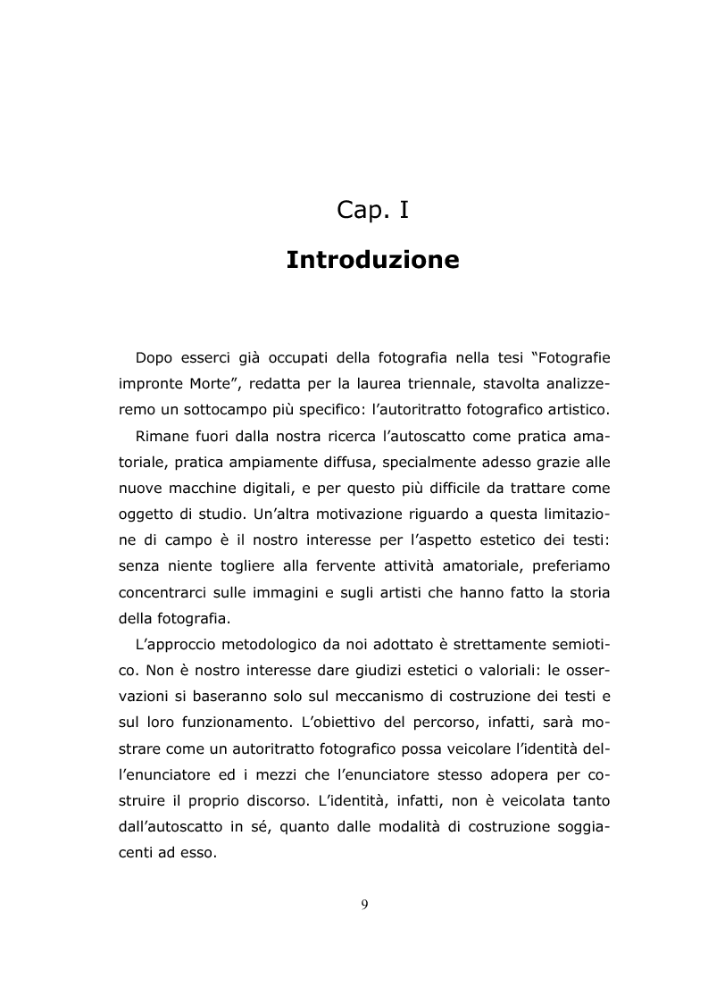 La nostra tesi inizia con un’introduzione dove viene spiegato il significato persuasivo dell’autoscatto, soprattutto in funzione della laurea specialistica in “Teorie della comunicazione e tecniche dei linguaggi persuasivi” nella quale la nostra tesi si inserisce. Il capitolo prosegue con alcune necessarie indicazioni metodologiche e di approccio, oltre ad una breve spiegazione dell’importanza di analizzare il corpo nell’autoscatto.