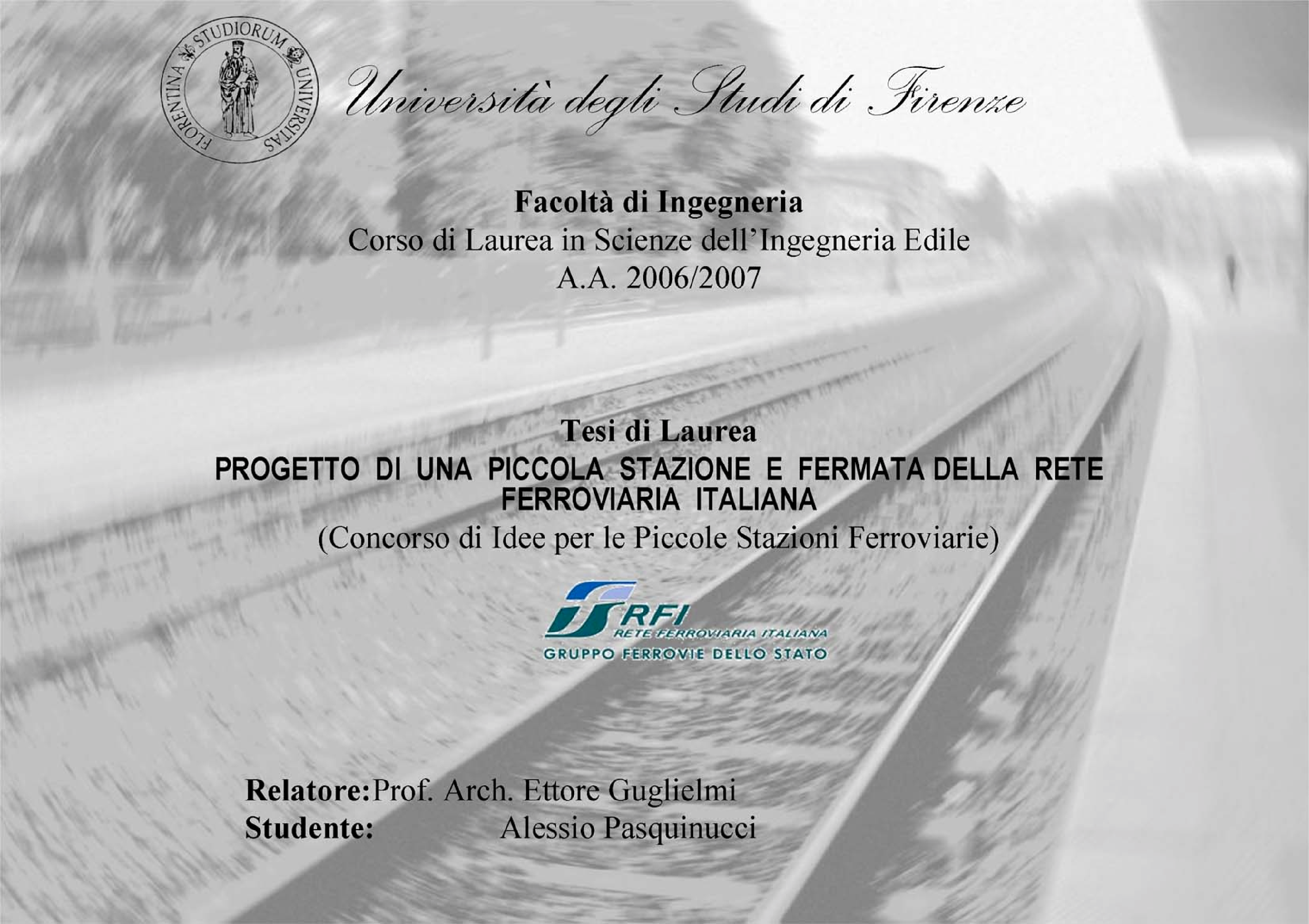 E’ stato preso in considerazione come oggetto di tesi questo concorso proprio per affrontare sia un tema di progettazione analizzando nuove tipologie edilizie, sia concretizzando l’elaborato andando ad analizzare l’aspetto della standardizzazione delle opere edili. Infatti fulcro centrale del progetto è l’esigenza di definire nuovi tipologie funzionali e manufatti ripetibili. Ottenere una nuova immagine per le ferrovie, al tempo stesso mantenendo omogeneità nelle strutture e riconoscibilità nel contesto urbano. Infine si è fatto riferimento alla ricerca ed uso di materiali riciclabili a fine "ciclo vita", (acciaio, alluminio, policarbonato) industrializzabili e utilizzati in strutture modulari.