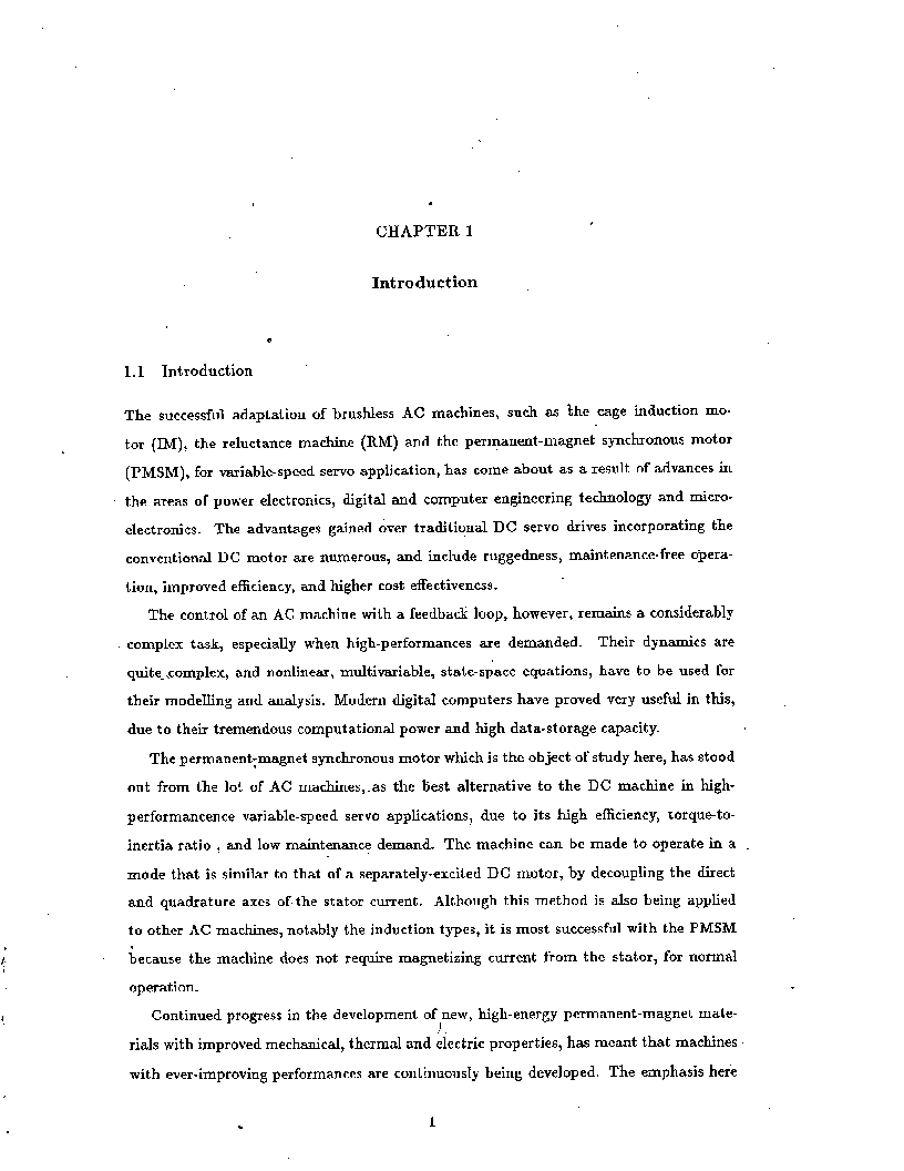 The permanent-magnet synchronous motor has not yet evolved as a standard off-the-shelf servo motor, because of the ongoing research for high-energy, permanent-magnet materials with improved magnetic and mechanical properties. Furthermore, the numerous possible configurations for the permanent magnet rotor, has meant that the machine exisits in several versions, each with its own unique properties and requiring unique control and power supply arrangements.