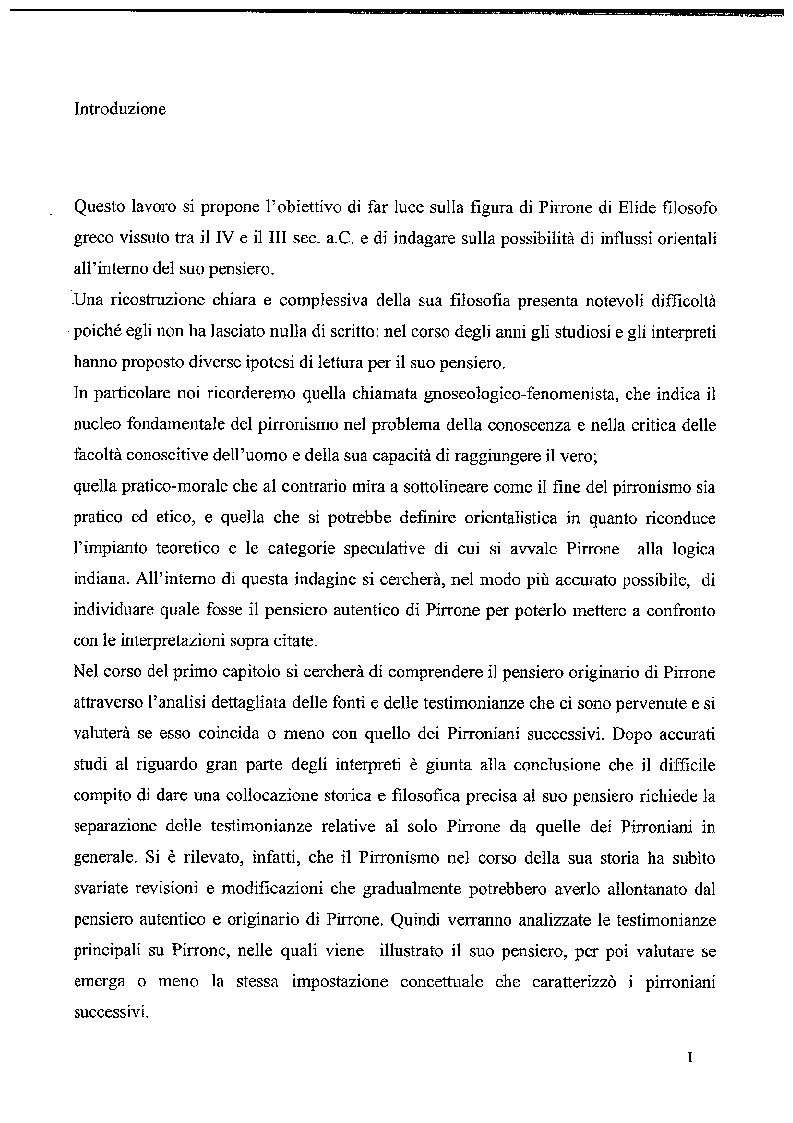 Questo lavoro si propone l'obiettivo di far luce sulla figura di Pirrone di Elide filosofo greco vissuto tra il IV e il III sec. a.C. e di indagare sulla possibilità di influssi orientali all'interno del suo pensiero. Una ricostruzione chiara e complessiva della sua filosofia presenta notevoli difficoltà poiché egli non ha lasciato nulla di scritto: nel corso degli anni gli studiosi e gli interpreti hanno proposto diverse ipotesi di lettura per il suo pensiero. In particolare noi ricorderemo quella chiamata gnoseologico-fenomenista, che indica il nucleo fondamentale del pirronismo nel problema della conoscenza e nella critica delle facoltà conoscitive dell'uomo e della sua capacità di raggiungere il vero; quella pratico-morale che al contrario mira a sottolineare come il fine del pirronismo sia pratico ed etico, e quella che si potrebbe definire orientalistica in quanto riconduce l'impianto teoretico e le categorie speculative di cui si avvale Pirrone alla logica indiana. All'interno di questa indagine si cercherà, nel modo piaccurato possibile, di individuare quale fosse il pensiero autentico di Pirrone per poterlo mettere a confronto con le interpretazioni sopra citate.