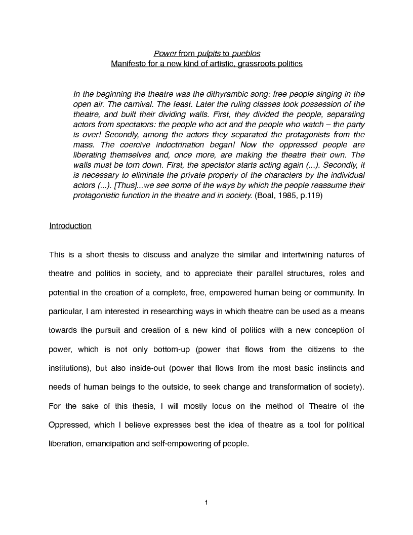 My senior project is a thesis that explores the techniques of Theatre of the Oppressed as a new way to approach the issues of politics and power in a society. It draws parallels between the possibility that audiences have to participate in the making of a play and the intrinsic power that people have to participate in the political sphere of their society. It focuses on a discourse of the words politics and power, on a discussion of catharsis as a method to silence the audience both in theatre and in cinematography and on possibilities of liberation through theatre and conscientization.