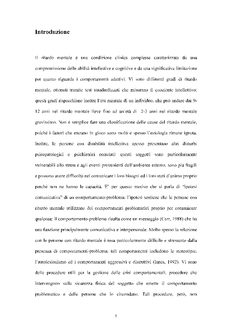 La tesi parla dei disturbi del comportamento di persone adulte che presentano un differente grado di ritardo mentale. i disturbi del comportamento approfonditi riguardano l'aggressività, le stereotipie e l'autolesionismo. Sono specificati i vari gradi del ritardo mentale secondo l'AAMR e l'ICD 10 oltre che il DSM. Infine si presenta un modello, quello di Fox "modello del trattamento meno restrittivo" che mostra le procedure che sarebbe meglio utilizzare con queste persone partendo da quelle meno restrittive fino ad arrivare al blocco fisico.