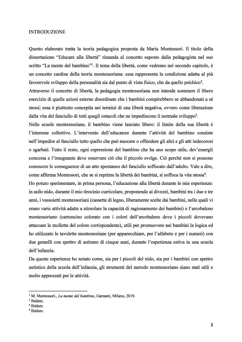 Questo elaborato tratta la teoria pedagogica proposta da Maria Montessori. Il titolo della dissertazione "Educare alla libertà" rimanda al concetto esposto dalla pedagogista nel suo scritto "La mente del bambino". Il tema della libertà, come vedremo nel secondo capitolo, è un concetto cardine della teoria montessoriana: essa rappresenta la condizione adatta al più favorevole sviluppo della personalità sia dal punto di vista fisico, che da quello psichico.