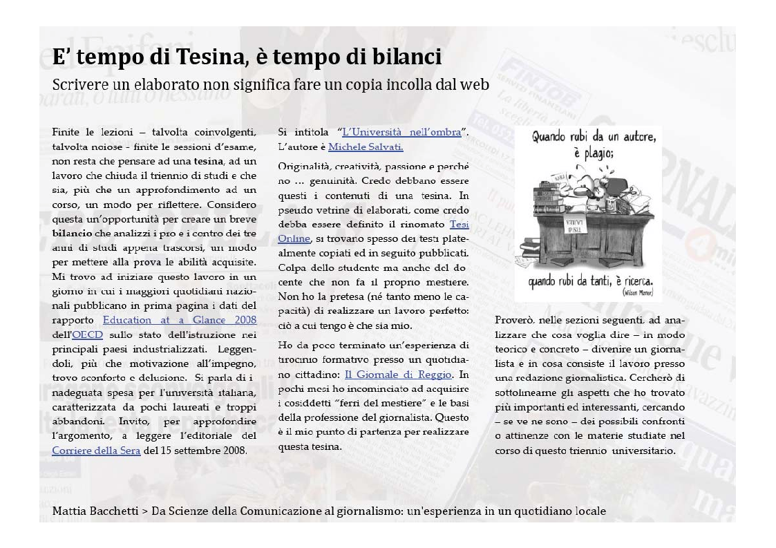 “Mattia Bacchetti presenta, con competenza e capacità comunicativa, la sua esperienza di stage in ambito giornalistico. Un e-book di grande interesse per i futuri stagisti della nostra Facoltà.“ prof. Corrado de Francesco