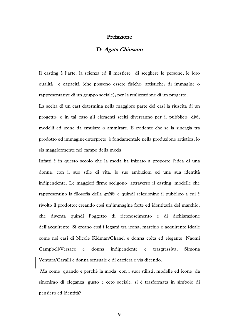Dopo una dettagliata analisi circa l’evoluzione del corpo, la rivoluzione della moda, l’emancipazione della donna, lo studio dei modelli di riferimento per il pubblico, è proprio in questo modo che si conclude il presente elaborato; con una breve analisi circa la spettacolarizzazione dell’evento moda e gli aspetti tecnici, ovvero i punti fondamentali che conducono alla costruzione di un casting di moda.