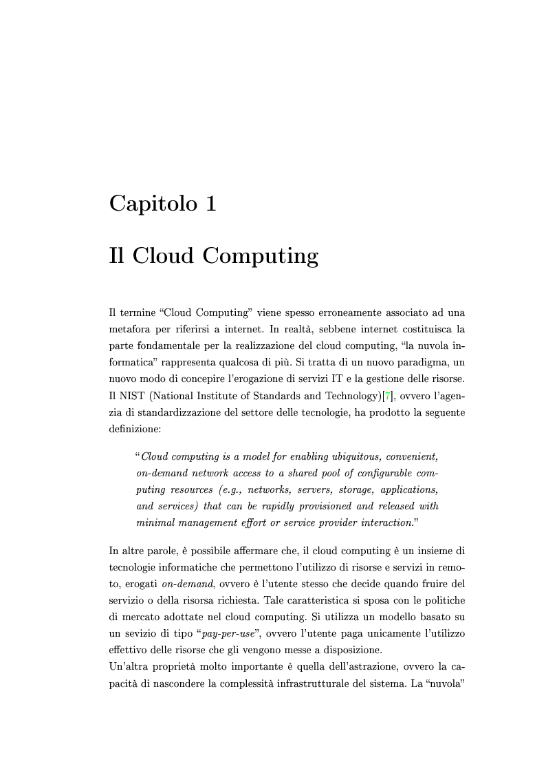 Nel primo capitolo si introduce la definizione di cloud computing, trattandone le principali caratteristiche, si descrivono poi, i diversi modelli di servizio e di distribuzione, delineando vantaggi e svantaggi che ne derivano.